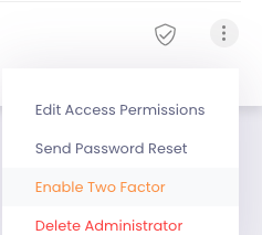 Click Admin Management from the left-hand side menu, find the user you wish to enable this feature and click the three dots, followed by Enable Two Factor. You will now see the Shield icon turn green indicating that 2FA is now active, once you sign in again you will be prompted to set up 2FA. To disable 2FA just follow the same steps.